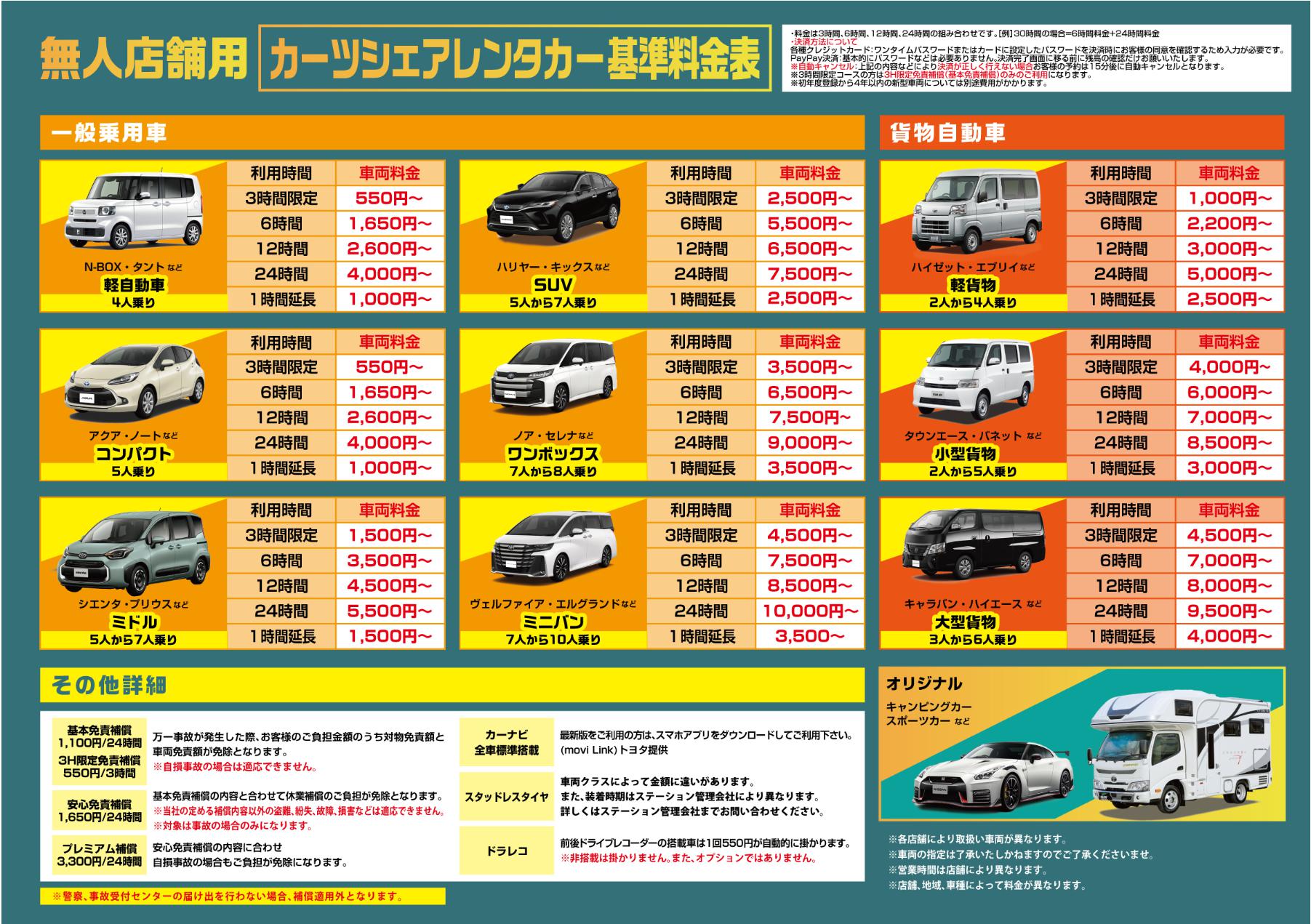 車種・利用時間ごとの詳しい料金は、以下の料金表をご確認ください。